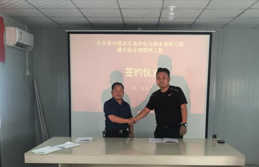 5月21日下午,山東魚臺(tái)原水生態(tài)凈化與供水系統(tǒng)工程城鄉(xiāng)結(jié)合部管網(wǎng)工程施工簽約儀式在魚臺(tái)縣順利舉行。水發(fā)金水建設(shè)工程有限公司總經(jīng)理蘇福貴、山東水發(fā)賢達(dá)水務(wù)有限公司總經(jīng)理潘愛(ài)國(guó)出席并簽訂了合同。