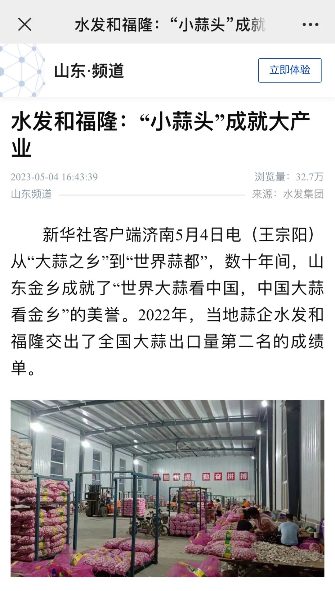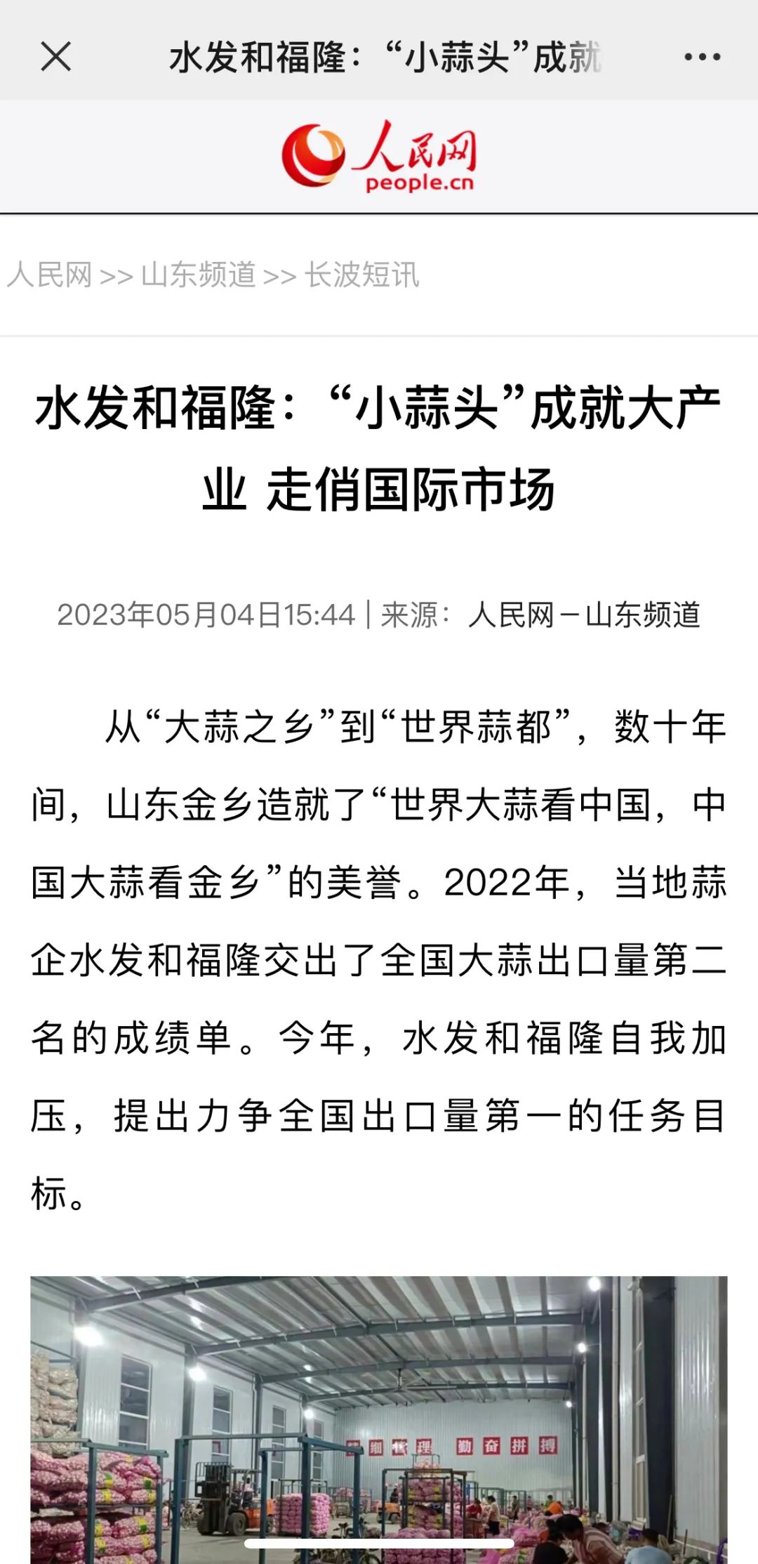 從“大蒜之鄉(xiāng)”到“世界蒜都”,數(shù)十年間,山東金鄉(xiāng)造就了“世界大蒜看中國,中國大蒜看金鄉(xiāng)”的美譽。2022年,當?shù)厮馄笏l(fā)和福隆交出了全國大蒜出口量第二名的成績單。今年,水發(fā)和福隆自我加壓,提出力爭全國出口量第一的任務(wù)目標。