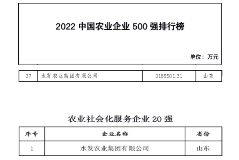 12月23日,“2022中國(guó)農(nóng)業(yè)企業(yè)500強(qiáng)”榜單正式發(fā)布,水發(fā)農(nóng)業(yè)集團(tuán)有限公司(以下簡(jiǎn)稱“水發(fā)農(nóng)業(yè)”)榮登“2022中國(guó)農(nóng)業(yè)企業(yè)500強(qiáng)”榜單,排名第37位,較去年上升46位。同時(shí),水發(fā)農(nóng)業(yè)還入選了“農(nóng)業(yè)社會(huì)化服務(wù)企業(yè)20強(qiáng)”榜單,排名第1位。